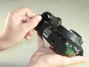 Снимите нижнюю панель с камеры, потянув пальцами за выступ внутри отсека батареи.