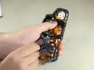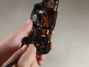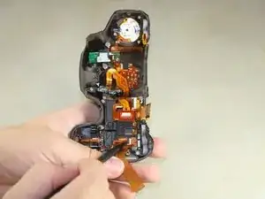 Черная ленточная проводка соединяет заднюю панель с внутренней частью камеры. Повреждение этой проводки сделает ваш задний экран и кнопки неработоспособными.