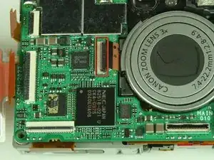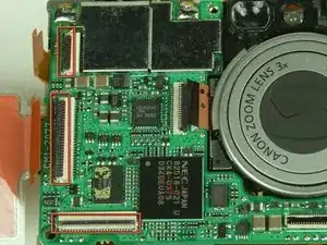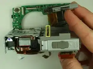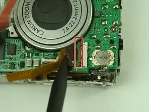 Найдите разъем ленточного кабеля слева от объектива на основной плате.