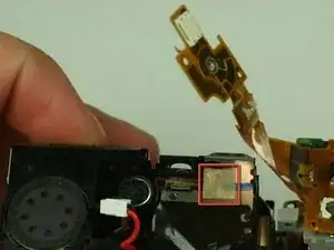 При снятии корпуса не уроните маленькую черную пластиковую деталь. Эта деталь расположена в небольшом зазоре над объективом, слева от вспышки и под корпусом камеры.