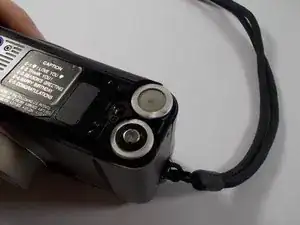 На этом шаге вы удалите батареи. Если наклонить камеру горизонтально, батареи просто выпадут, что гораздо проще, чем пытаться извлечь их из отсека.