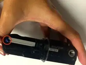 Держите камеру одной рукой, продолжая давить большим пальцем на крышку, сдвиньте крышку вправо.