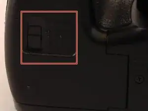 Нажмите и удерживайте переключатель в сторону линий. Затем отодвиньте его от камеры, чтобы открыть отсек для батарей.