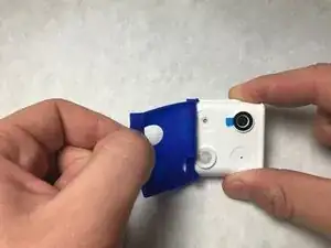 Определите объектив камеры в нижнем левом углу изображения, который можно заменить, заменив целиком крышку. Также показана задняя сторона крышки. Камера сейчас находится в верхнем правом углу изображения.