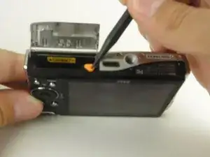 Нажмите на оранжевый механизм освобождения с помощью лопатки в направлении стрелки, освободив батарею.