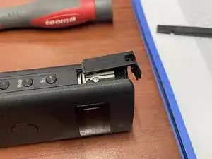 Батарея приклеена лентой к держателю, который необходимо открутить.