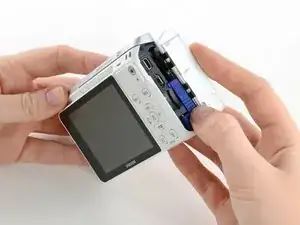 Сдвиньте синюю дверцу влево, чтобы освободить батарею, и извлеките батарею.