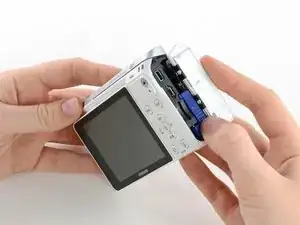 Используйте лопатку или ноготь, чтобы открыть отсек для батареи с правой стороны камеры.