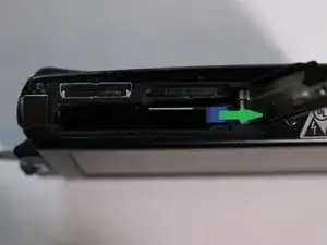 Внутри отсека для батареи находится маленький синий рычажок. Нажмите этот рычажок назад, чтобы освободить батарею.