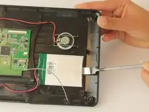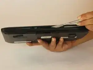 Удалите батарею из корпуса, подложив под нее лопатку. (Примечание: показанная лопатка металлическая, для обеспечения безопасности используйте нейлоновую или пластиковую лопатку.)