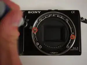 С фронтальной стороны камеры снимите четыре серебристых винта #00 с металлического байонета объектива.