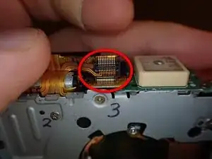 Отключите ленточный кабель вспышки от верхней части камеры рядом с антенной GPS.