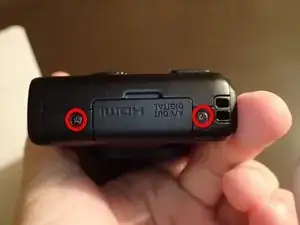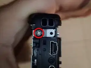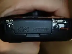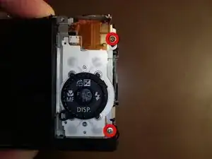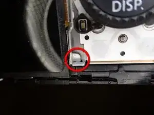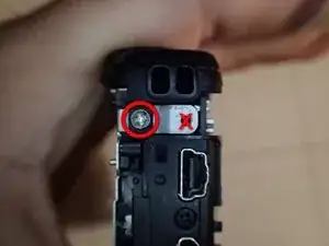 Переверните камеру и открутите винт кронштейна дисплея вблизи верхнего правого угла экрана.