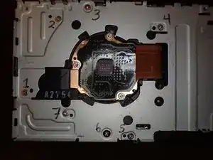 Снимите оставшиеся 5 пронумерованных винтов (3–7) с задней части камеры (винты 5 и 6 короче всех остальных пронумерованных винтов и отличаются друг от друга; остальные пронумерованные винты, похоже, одинакового размера, включая 1 и 2).