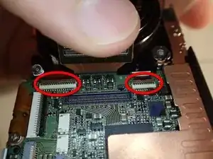Отстегните и отключите шлейфы блока объектива (над и под кабелем матрицы).
