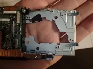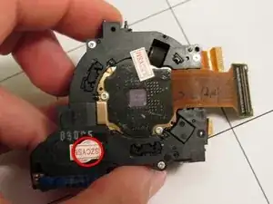 Переверните камеру и снимите узел объектива. Может потребоваться немного пошевелить. Приподнимите правый нижний угол, затем аккуратно потяните узел объектива вправо, и он выскользнет.