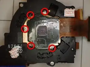 На задней части камеры семь винтов вокруг отверстия, через которое видно заднюю часть матрицы и блока объектива. Рекомендуется пронумеровать их маркером и нанести соответствующие номера на рабочую панель, чтобы винты не перепутались при демонтаже.