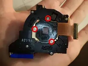 Снимите 3 винта, крепящие матрицу к задней части узла объектива, и извлеките матрицу, отметив наличие маленьких латунных шайб/прокладок, которые могут находиться под винтами. Извлекайте матрицу аккуратно, не касаясь поверхности сенсора и не допуская попадания пыли.