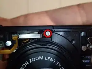 Открутите винт, крепящий верхнюю крышку к передней части камеры над объективом (длиннее остальных винтов верхней крышки).