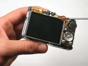 Поднимите ЖК‑экран, НЕ снимая его полностью. Экран всё ещё подключён к камере через ленту подсветки под ним.