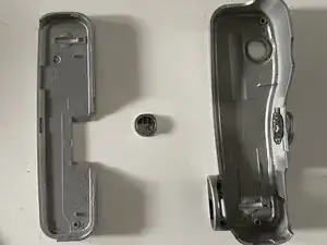 Снимите серебристую панель с верхней части камеры. Она слабо защёлкнута и должна сниматься легко.