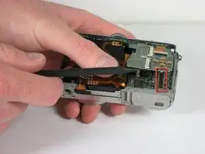 С помощью лопатки отсоедините плоский шлейф от платы. Поднимите чёрную защёлку вверх, чтобы разблокировать её, как и ранее.