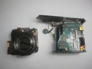 Осторожно отсоедините два ленточных кабеля, соединяющие объектив с материнской платой.