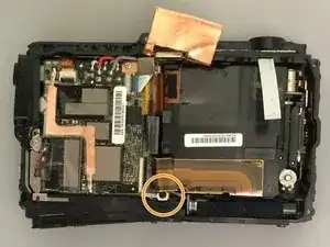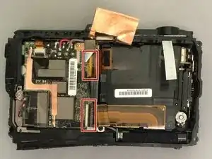 Найдите зажим для оранжевого шлейфа между материнской платой и блоком объектива.