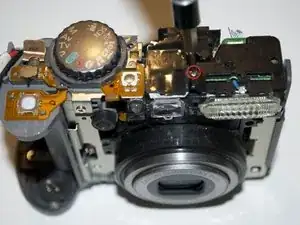 Удалите один (1) винт с верхней части фотоаппарата, слева от вспышки (смотря спереди), используя крестовую отвёртку Phillips #00.