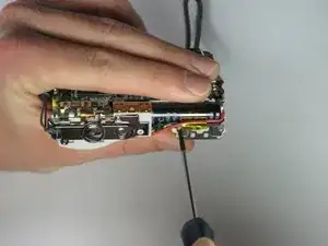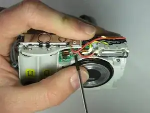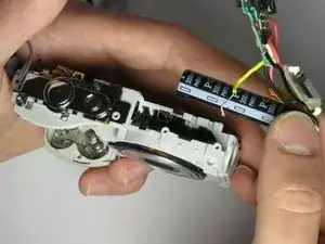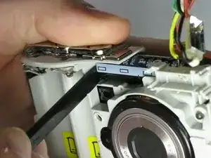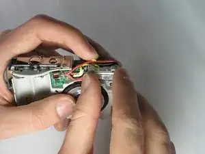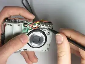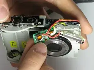 Отсоедините плату цепи вспышки и подсборку лампы вспышки от передней части камеры, потянув их назад.