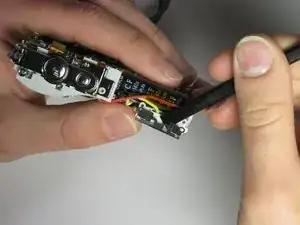 С помощью заострённого конца лопатки поднимите обе полоски ленты на верхней части подсборки лампы вспышки.