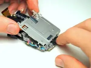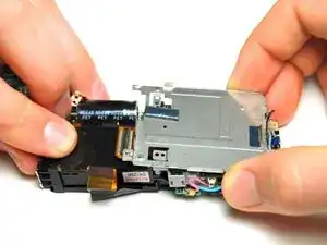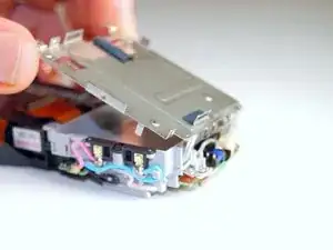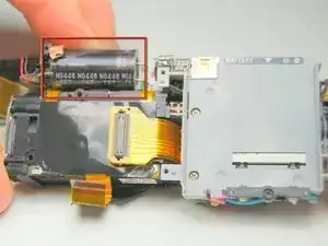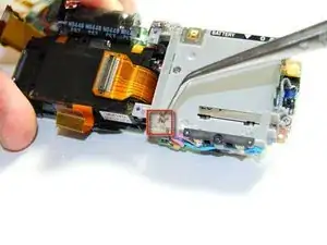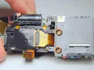 Пинцетом аккуратно отсоедините ленточную плату в верхнем правом углу модулей, подключённую к кнопке спуска затвора/питания.