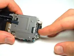 Отсоедините медную ленточную плату от внутренностей камеры, прижав пальцем клемму сверху и аккуратно потянув заднюю крышку.