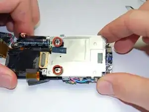 Удалите чёрный винт 4,3 мм в верхней правой части камеры, а также серебристый винт 4,3 мм в нижней правой части камеры.