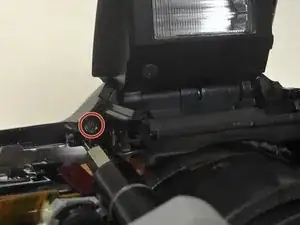 Отвинтите винт, расположенный в заднем левом углу блока вспышки.