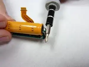 Разрядите жёлтый конденсатор, подключённый к блоку вспышки, замкнув выводы отвёрткой.