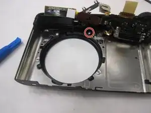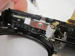 Удалите серебристые винты Phillips 4 мм, используя отвёртку с насадкой J00, с металлической детали и снимите винты 4 мм с металлической детали, выстилающей отверстие узла объектива.