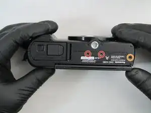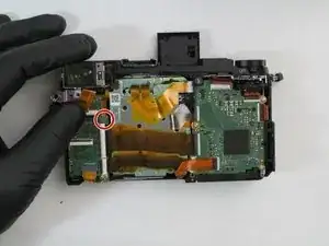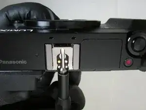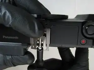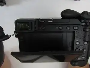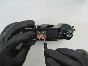 Снимите серебристый винт Phillips #0 (2,5 мм), расположенный под видоискателем.