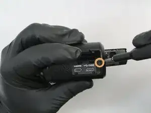 Откройте крышку разъёма и снимите чёрный винт Phillips #0 (4,0 мм) внутри.