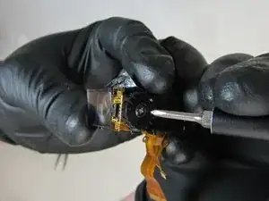Снимите небольшой ленточный кабель, аккуратно потянув его от камеры пинцетом, безопасным для ЭСР.