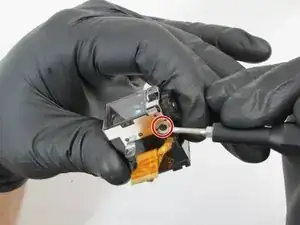 Снимите серебристый винт Phillips #0 (3,5 мм) из центра колесика фокусировки.