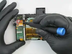 Отверните чёрный винт Phillips #0 (4,5 мм), расположенный у верхней части экрана, повернув верхнюю часть экрана от корпуса камеры.