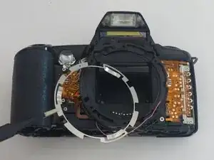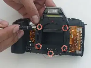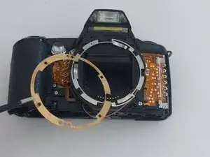 Это необходимая процедура для замены деталей байонета объектива камеры Canon EOS Rebel XS 35mm, расположенного на передней части корпуса. Эти детали включают тонкий, похожий на латунь слой и серебристый слой. Оба этих слоя располагаются внутри кольца на передней части камеры определённым образом.