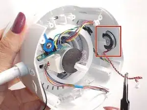 Динамик круглой формы, черный и серебристый, с красным и черным шнуром. Его легко снять с верхней части камеры с помощью пальцев или безопасных пинцетов.