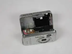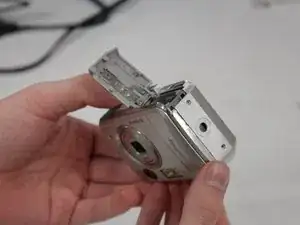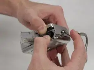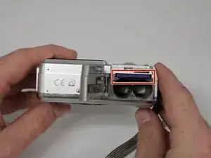 Разведите корпус. Обратите внимание, что корпус плотно закрыт и его будет трудно открыть. Используйте пластиковый инструмент для открытия по шву между двумя половинками корпуса и вставьте два пальца в отсек для батареек, чтобы создать рычаг для разъёма. Отсек для батареек прикреплён к той половинке корпуса, где находится объектив.