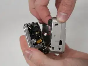 Найдите динамик в конце пары красного и чёрного проводов, удерживающих половинки корпуса вместе. Следите, чтобы не тянуть провода, иначе они могут оторваться от материнской платы и повредить камеру.