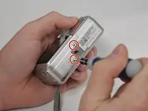Найдите два винта 3,0 мм на стороне камеры с ремешком и отвинтите их трёхточечной отвёрткой с наконечником Y0.