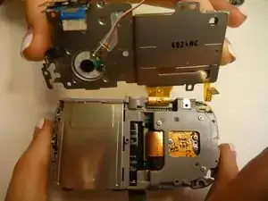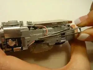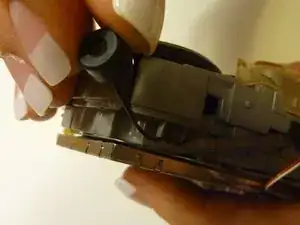 Аккуратно отведите экран LCD от внутреннего корпуса камеры, удерживая толстую жёлтую ленту проводки, прикреплённую к корпусу.