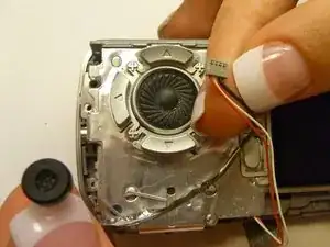С помощью пинцета аккуратно приподнимите динамик, осторожно отводя провод от боковой части внутреннего корпуса к передней части корпуса.