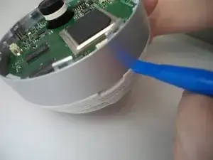 Приложите давление пластиковым инструментом для открывания к различным участкам серой пластиковой ленты, чтобы отжать ее от белой пластиковой задней части корпуса.